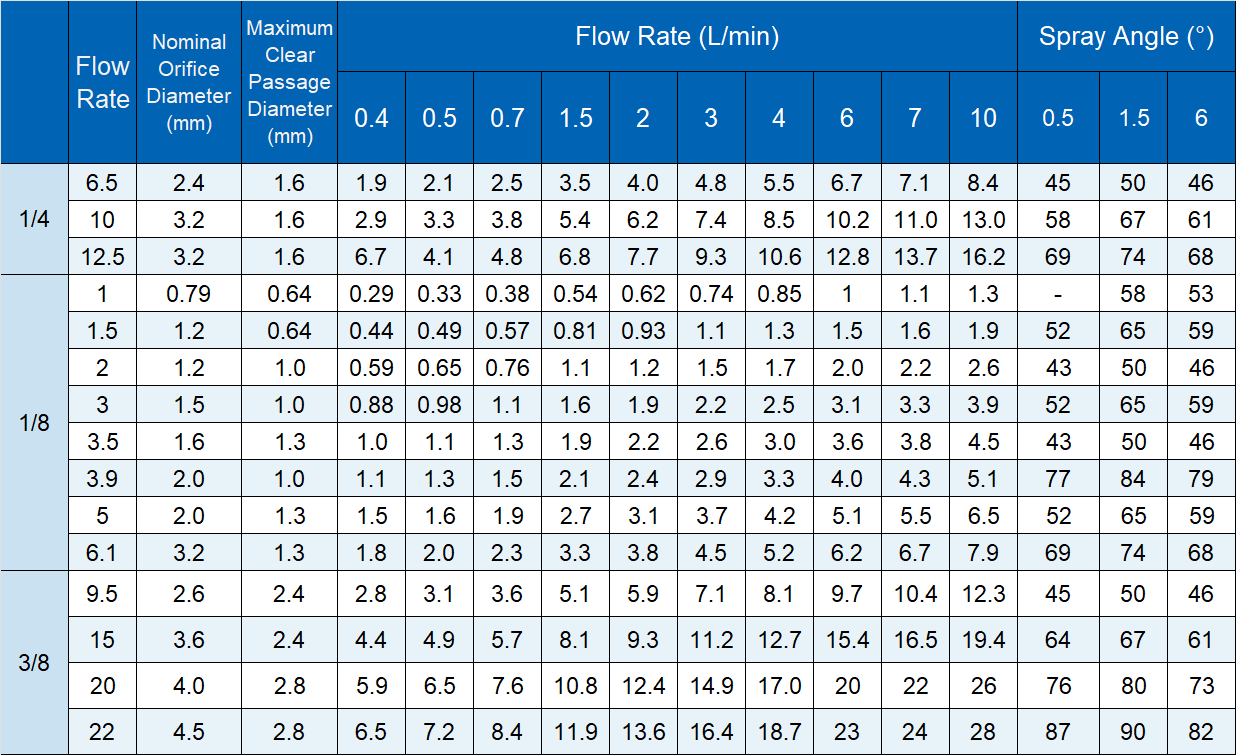 Solid conical spray shape produces a circular impact area. Characterized by uniform distribution, a wide range of pressure and flow rates, and medium to large droplet sizes.